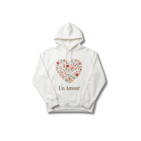 Sweat à capuche, cœur floral au centre et texte “Un Amour”. Idéal en cadeau.